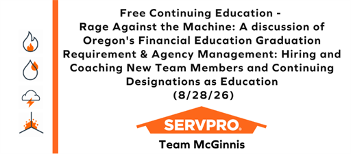 SERVPRO Team McGinnis Continuing Education - Rage Against the Machine: A discussion of Oregon's Financial Education Graduation Requirement & Agency Management: Hiring and Coaching New Team Members and Continuing Designations as Education 8/28/2026